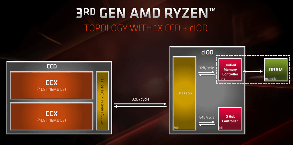 The architecture that is used on the ZEN 2 is a major step up from the 1st generation, offering up to 15% IPC improvements. The ZEN 2 architecture can feature up to two CCDs (Core chiplet die), and each of these CCDs can have a maximum of two CCXs (core complex). Each CCX holds up to four CPU cores. In the case of 3800XT, we get only one fully activated CCD with two CCXs featuring a total of eight CPU ZEN 2 cores. It also indicates that 3800XT is the fastest Zen 2 based chip AMD has with a single CCD. The two CCXs are interconnected with what AMD calls the Infinity Fabric. The Infinity Fabric has been a hot topic of discussion among Ryzen users since the performance can vastly be improved by using faster RAM. And since the chip does not have a second CCD activated, all of the 32MB L3 cache and the low-level L2 cache can be accessed by the two CCXs present.
