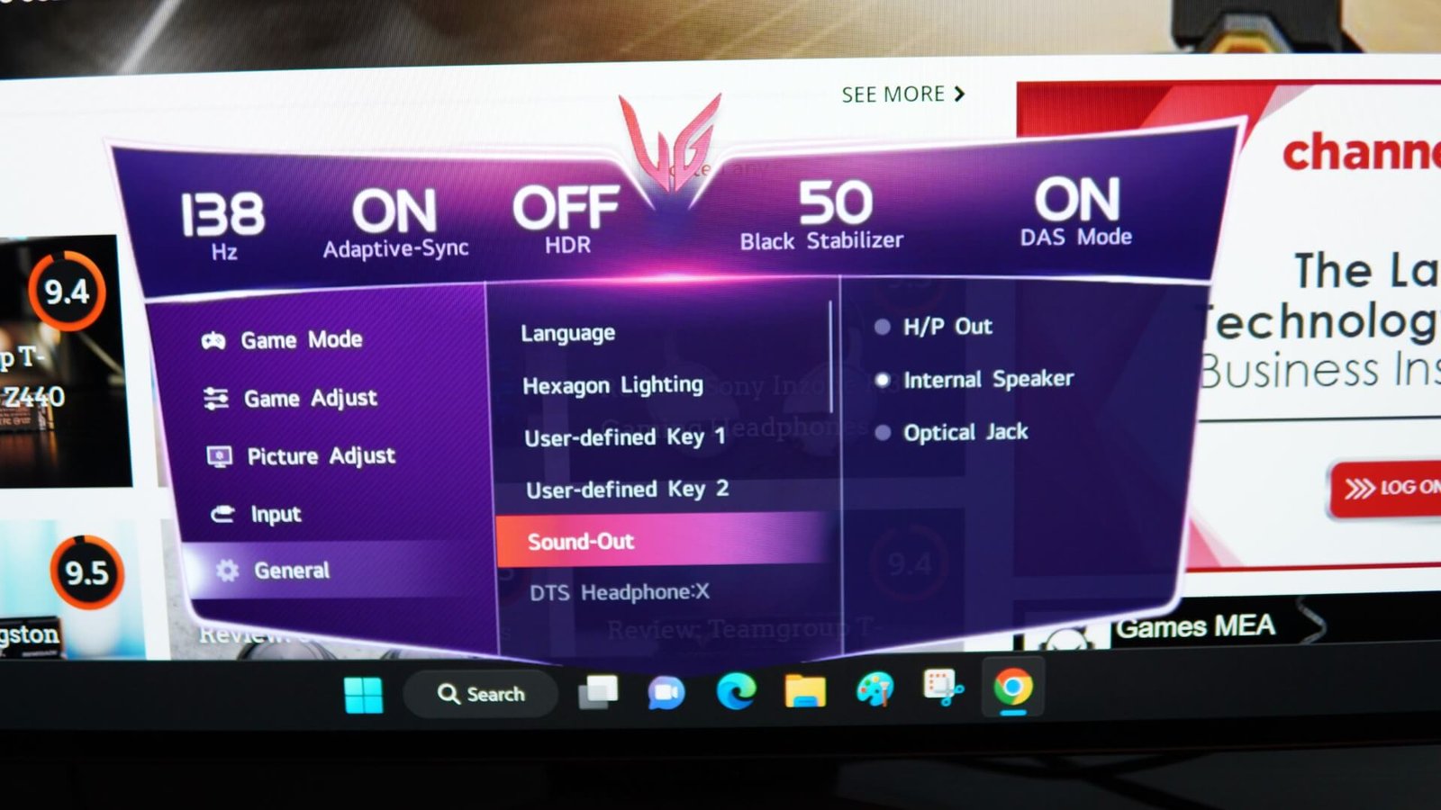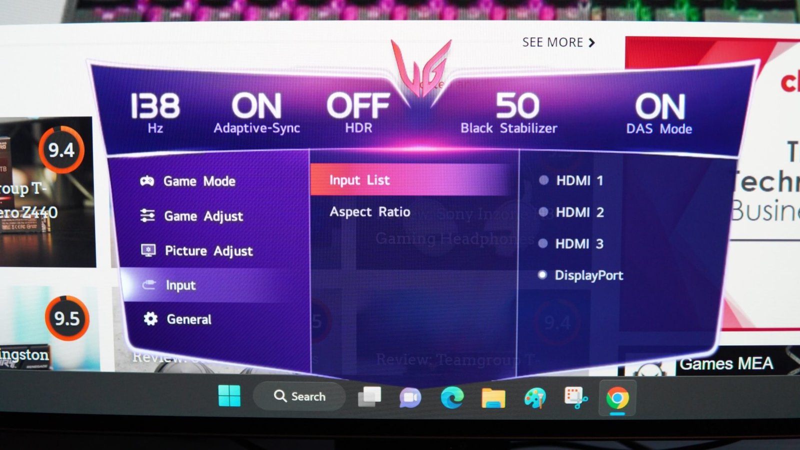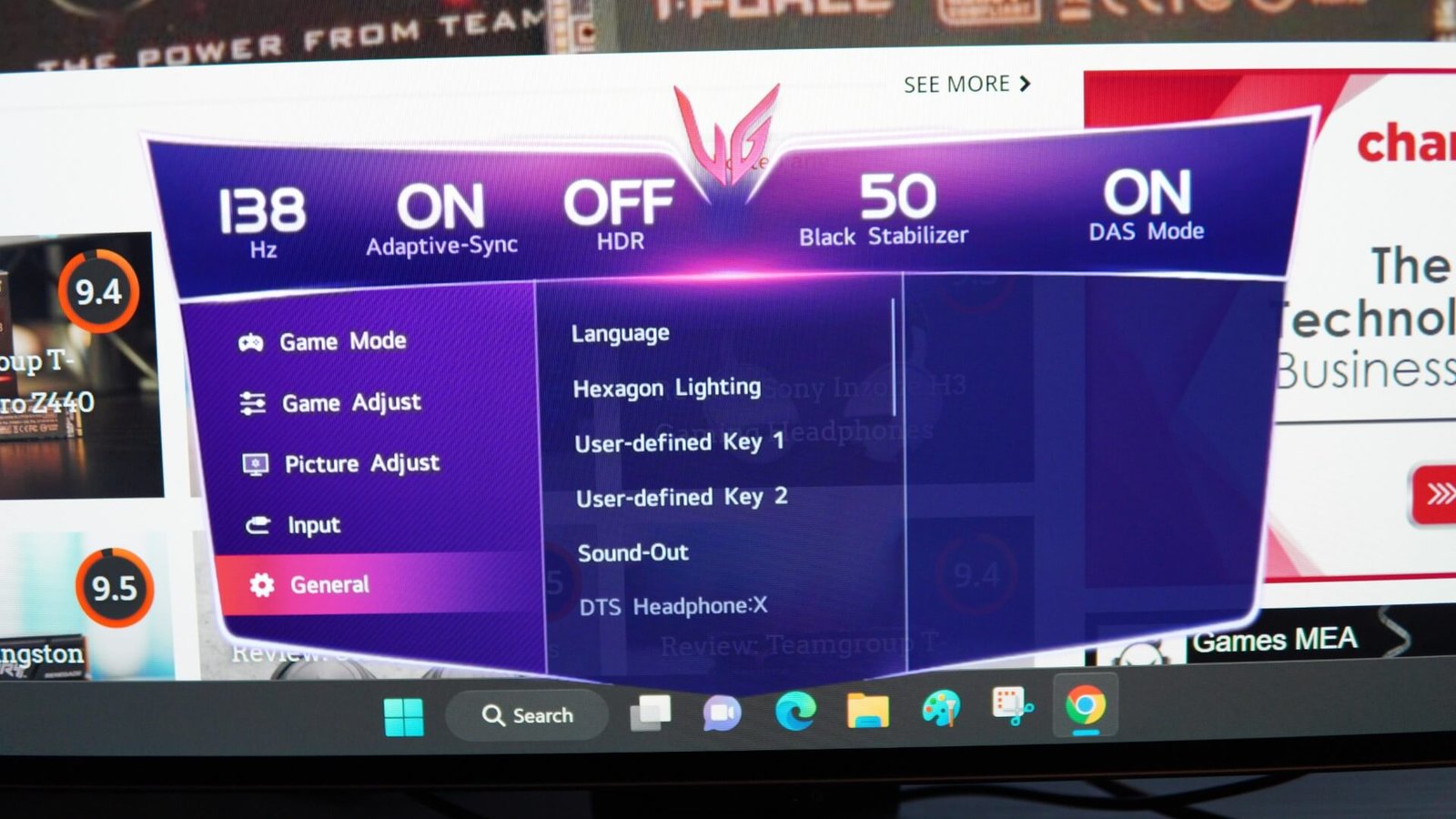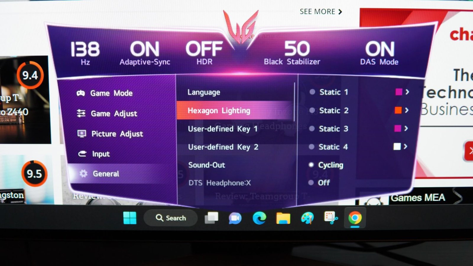 That said, three HDMI 2.1 ports mean you can connect the display to a Sony PS5, Microsoft Xbox Series X, and also a laptop, while the DisplayPort can be reserved for a gaming PC. The hexagon lighting system is located on the left and right sides of the gaming monitor in the form of stripes. The color changes based on the theme that you select from the OSD, and this includes either static colors or random color cycling. We hope that LG introduces an option (via a firmware update or for the next monitor iteration) where users are able to select static colors or custom color cycles based on the display input selected. You know, like blue color for PlayStation, green color for Xbox, and maybe, red or purple color for a gaming PC.