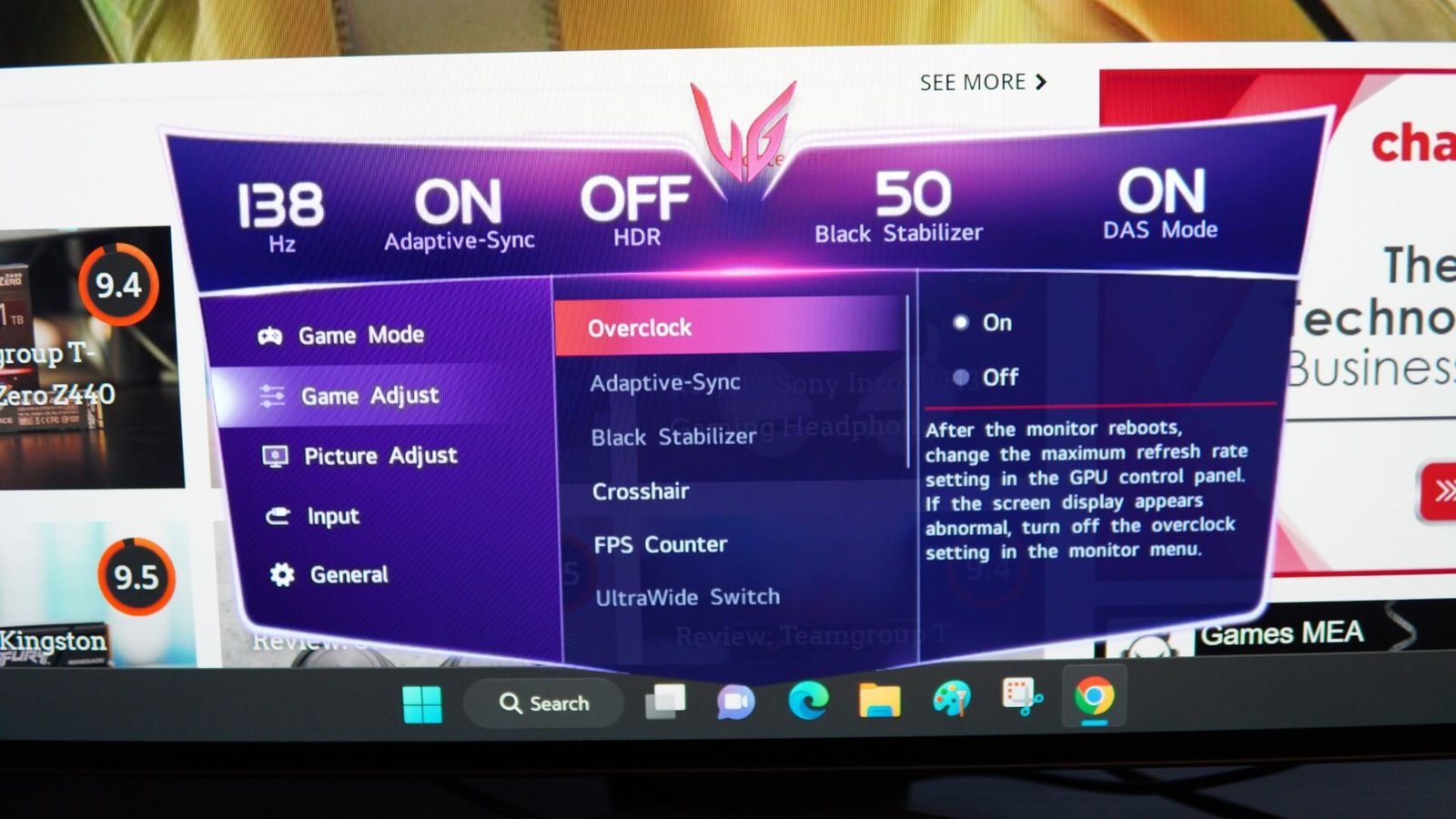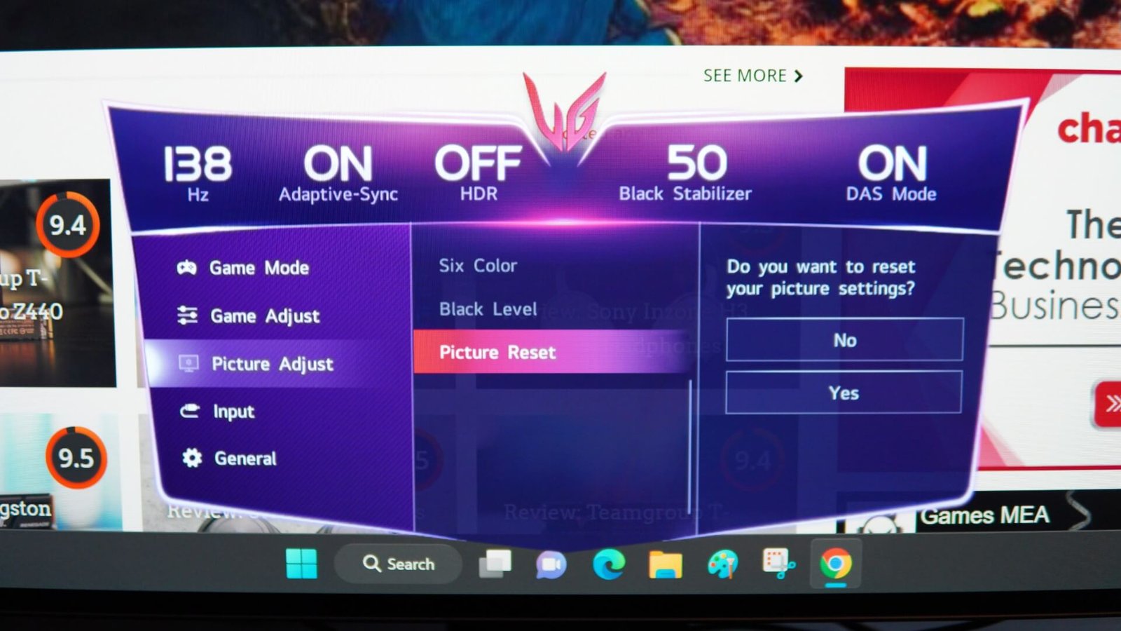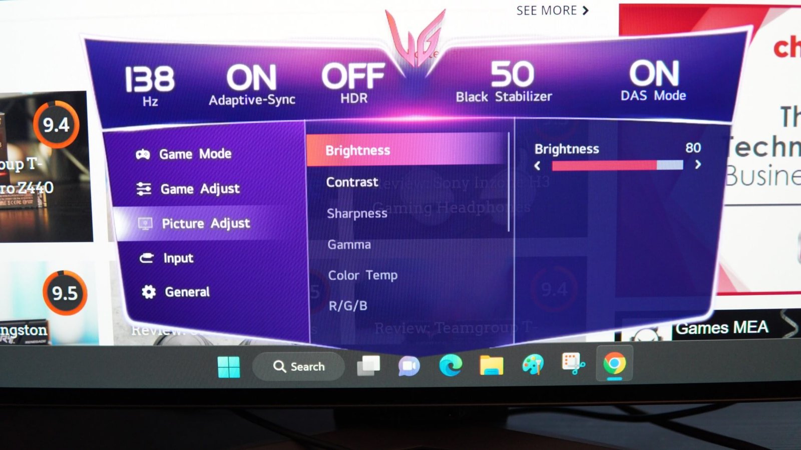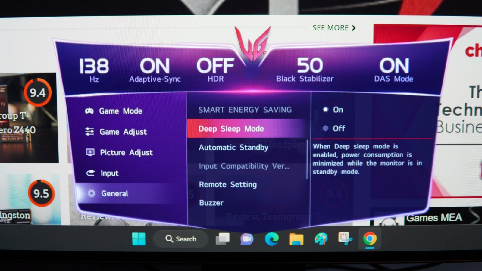 That said, three HDMI 2.1 ports mean you can connect the display to a Sony PS5, Microsoft Xbox Series X, and also a laptop, while the DisplayPort can be reserved for a gaming PC. The hexagon lighting system is located on the left and right sides of the gaming monitor in the form of stripes. The color changes based on the theme that you select from the OSD, and this includes either static colors or random color cycling. We hope that LG introduces an option (via a firmware update or for the next monitor iteration) where users are able to select static colors or custom color cycles based on the display input selected. You know, like blue color for PlayStation, green color for Xbox, and maybe, red or purple color for a gaming PC.