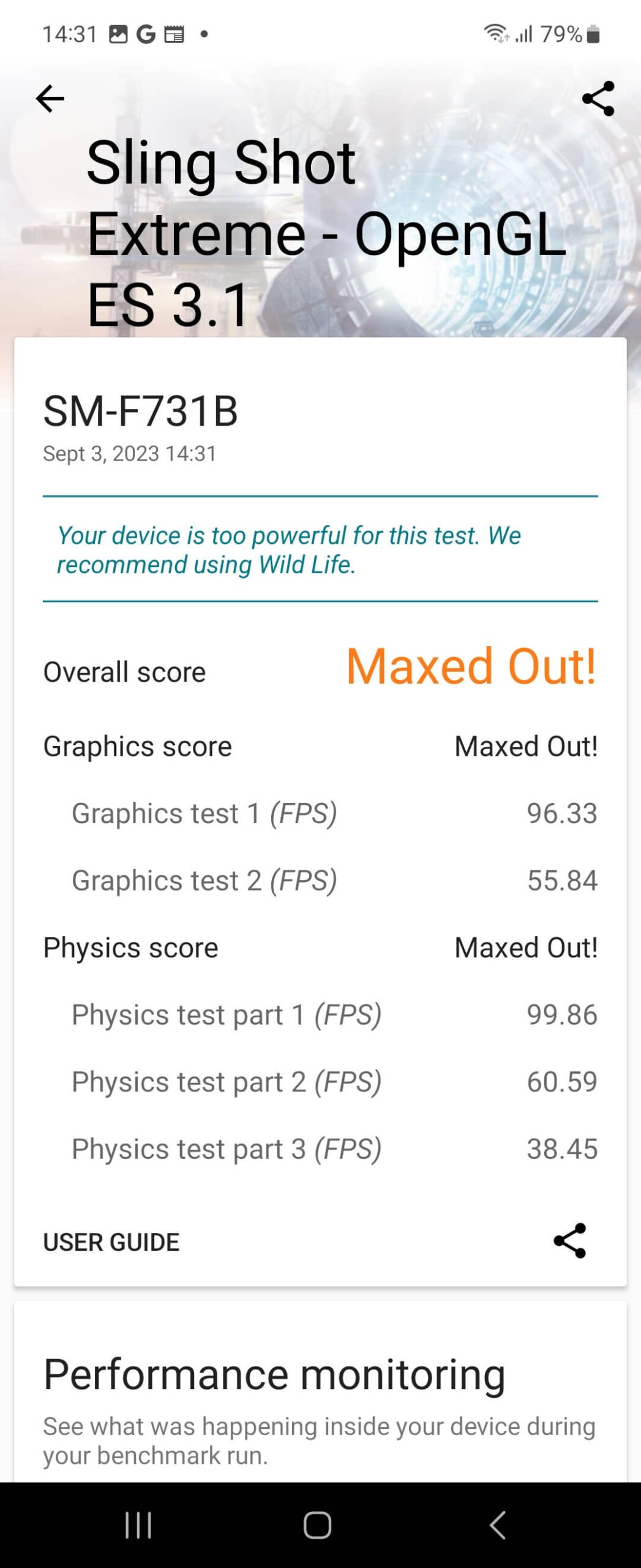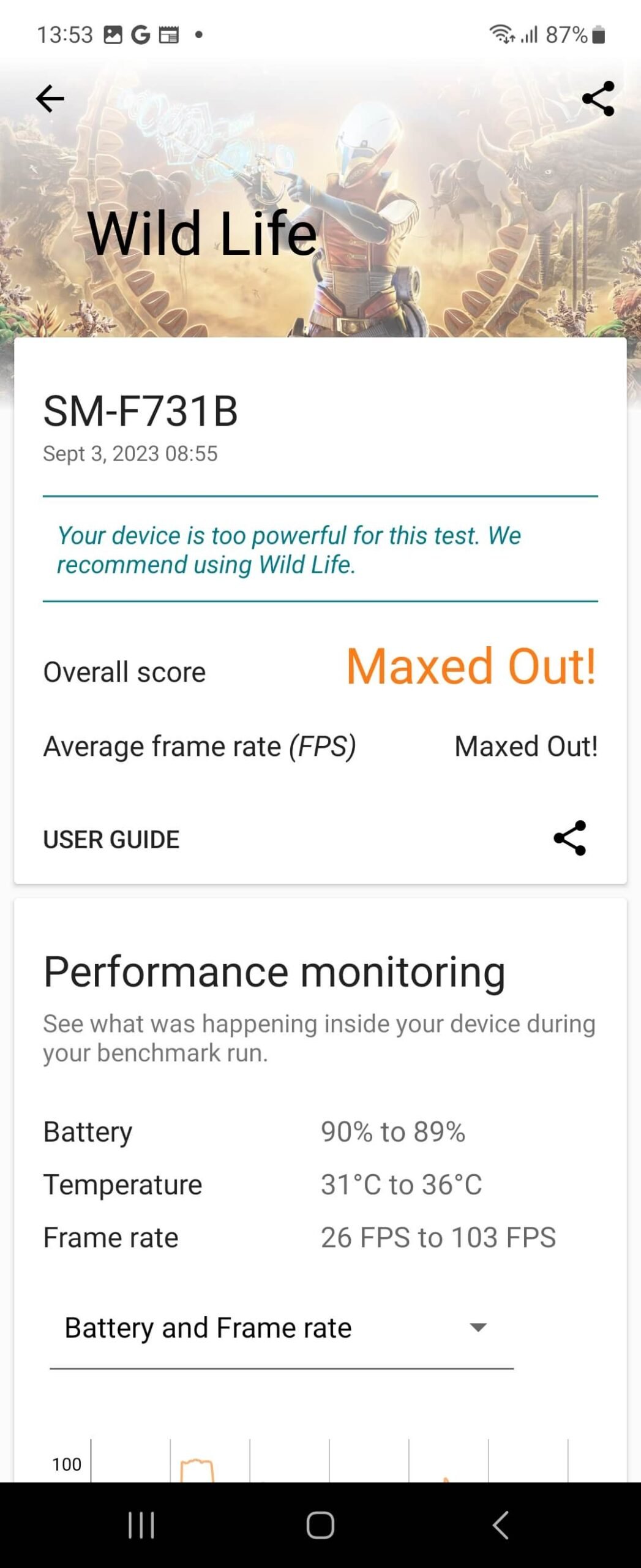 It’s unfortunate that Samsung did not include a MicroSD card slot for internal storage expansion. The Z Flip5 doesn’t fall short with respect to gaming capability, as the Snapdragon 8 Gen 2 SoC packs the Adreno 740 integrated GPU. We ran different benchmark tools such as Antutu, Geekbench 6, PC Mark Work 3.0, 3DMark WildLife, and SlingShot tests. Check out the scores below.
