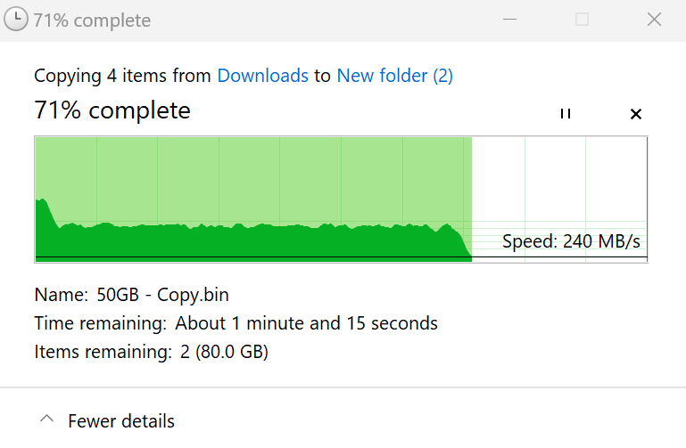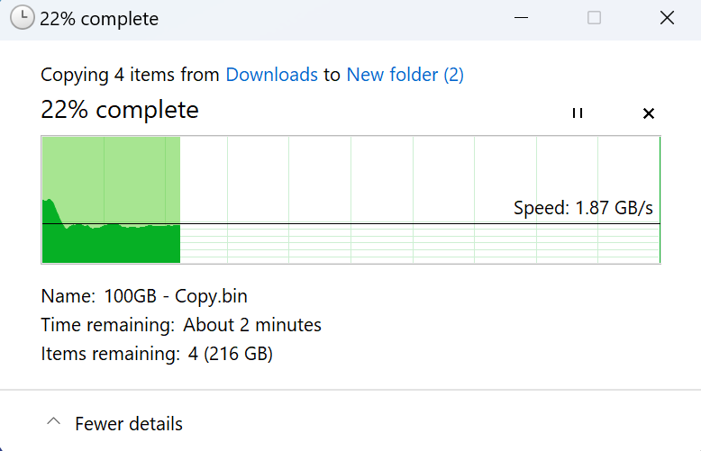 We ran a file transfer speed test by making a copy of 300GB dummy files. The speed at which the files were copied was an average of 1.9 GB/s. Even with HMB, the drive’s copy speed lasted at similar speeds up until there was 8GB left to be copied, and the speeds dropped down to 200 MB/s. This is a good performance for an HMB-enabled drive.