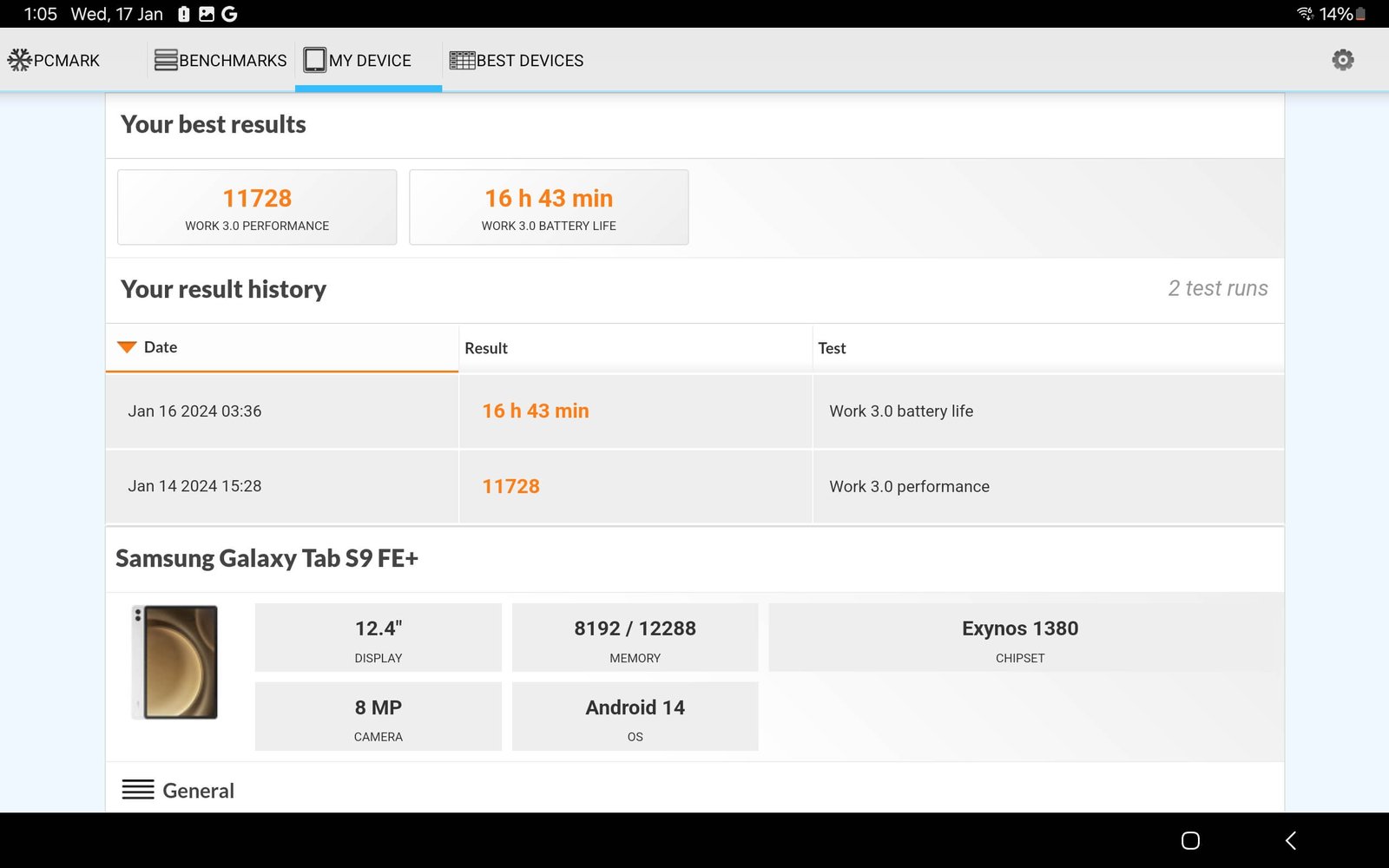 The Galaxy Tab S9 FE+ also houses a 10090 mAh Li-Po battery, featuring fast charge support of 45W (QC 2.0). We ran the PCMark 10 Work 3.0 battery test and the device ran from 100% battery capacity to 20% in 16 hours and 43 minutes. The additional 20% battery ensures we can get more run time out of the tablet.