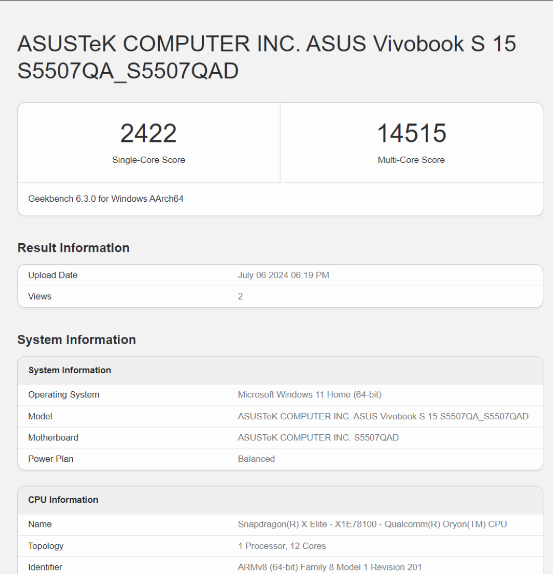 We ran some benchmarks on the Vivobook S 15 (S5507) laptop, including Geekbench 6, 3DMark FireStrike/TimeSpy, CineBench 2024, and CrystalDiskMark. Do keep in mind that at the time of review, we used the native ARM versions of Geekbench 6 and CineBench 2024, and the rest were x86 versions. Take a look at the scores below.