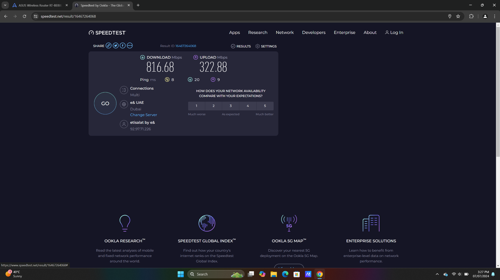 ASUS mentions that the router is capable of speeds up to 1376 Mbps when using the 2.4GHz network, and up to 5764 Mbps when using the 5GHz speeds. The WiFi standard used here is the latest 802.11be. The device also uses features such as OFDMA (Orthogonal Frequency Division Multiple Access), Beamforming (standard-based and universal), 20/40/80/160 MHz modes bandwidth, and 4096-QAM high data rate to enhance the performance.