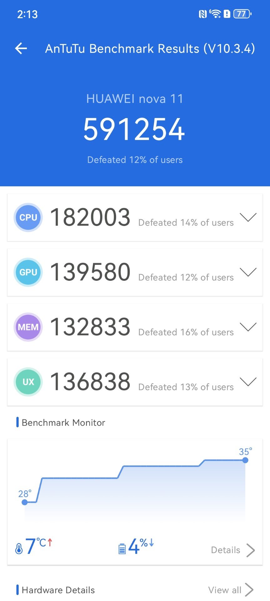 The Huawei nova 12s comes powered by the mid-range Snapdragon 778G SoC, an octa-core processor with four 2.4GHz Kryo 670 cores, and four 1.8GHz Kryo 670 cores. The SoC is paired with 8GB of RAM and 256GB of internal storage. The integrated GPU is the Adreno 642L. The EMUI 14.2 OS that runs on the smartphone, does not come with Google apps built-in, which is the case with other Huawei devices. While the nova 12s is a mid-range smartphone, the performance is quite impressive, and it performed well without any noticeable lags for day-to-day tasks. We ran some benchmarks on the nova 12s, and this includes Geekbench 5 CPU/GPU, Antutu, and PCMark 10. Check out the scores below.