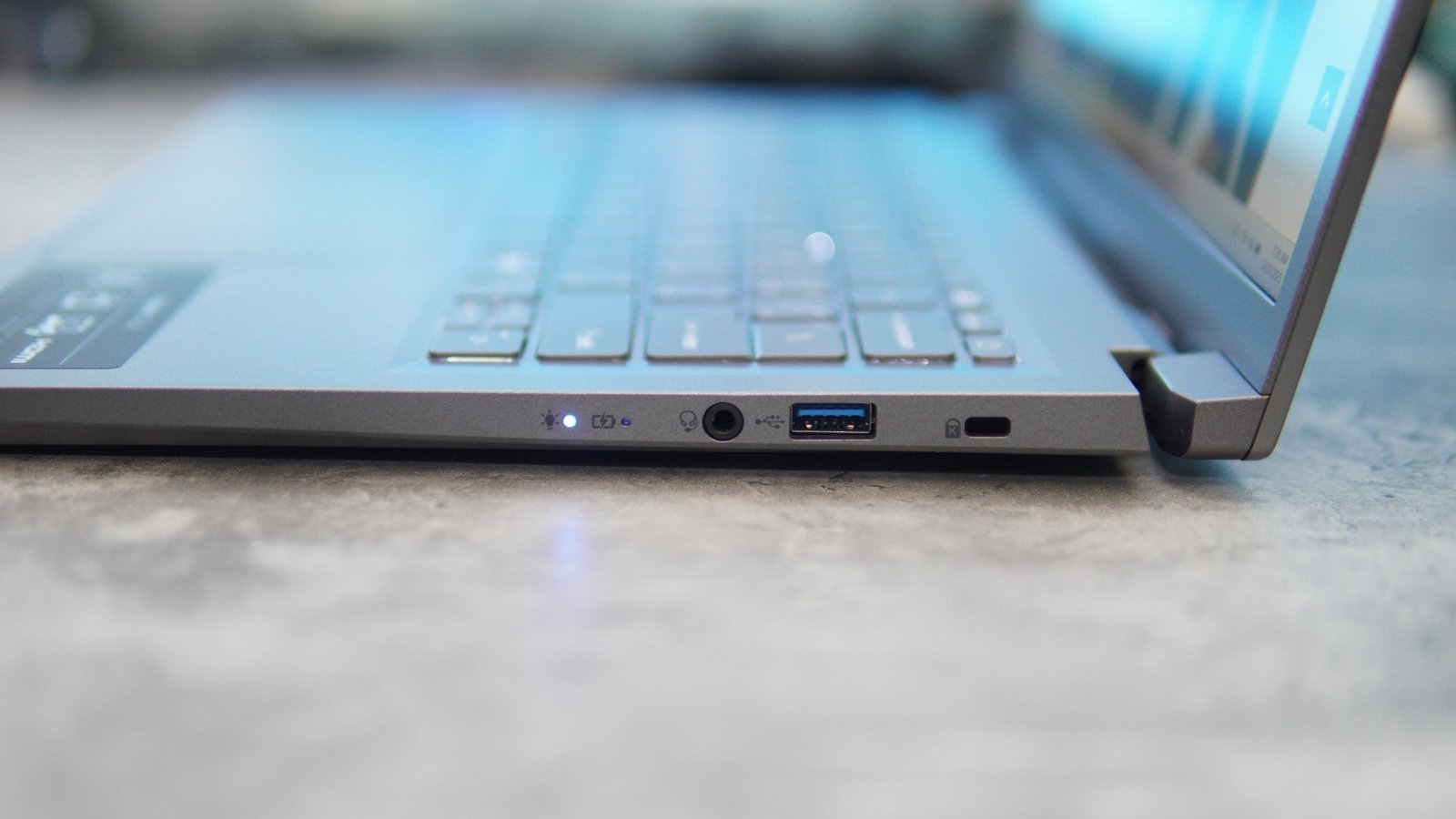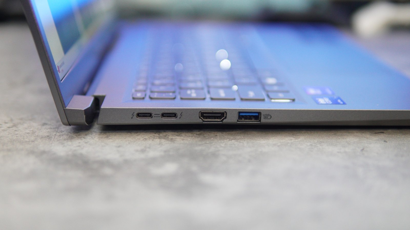 The device comes with several connectivity options. The left side comes with two USB 4 (USB-C) ports, one full-sized HDMI port, and one USB 3.2 Gen 1 Type-A port. There is another USB 3.2 Gen 1 Type-A port on the right side, along with a headphone jack and an indicator for battery status.