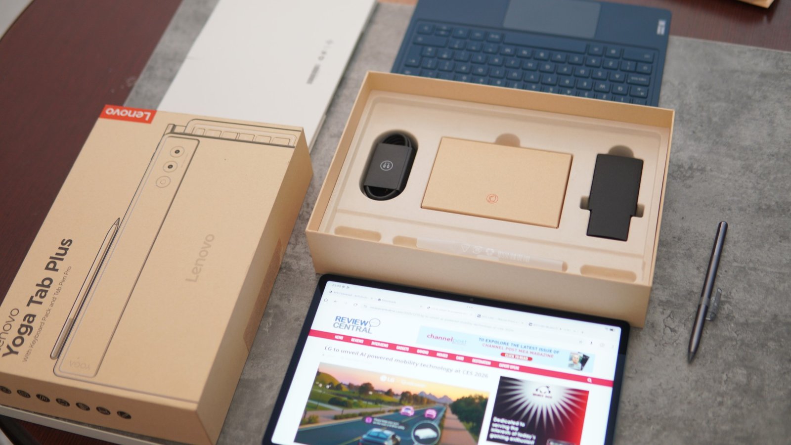 The package contents include the Lenovo Yoga Tab Plus tablet, the USB-C charging cable, the 45W in-box charging adapter, the Lenovo Tab Pen Pro, the Yoga Tab Plus keyboard, the kickstand, a quick start guide, and the warranty.