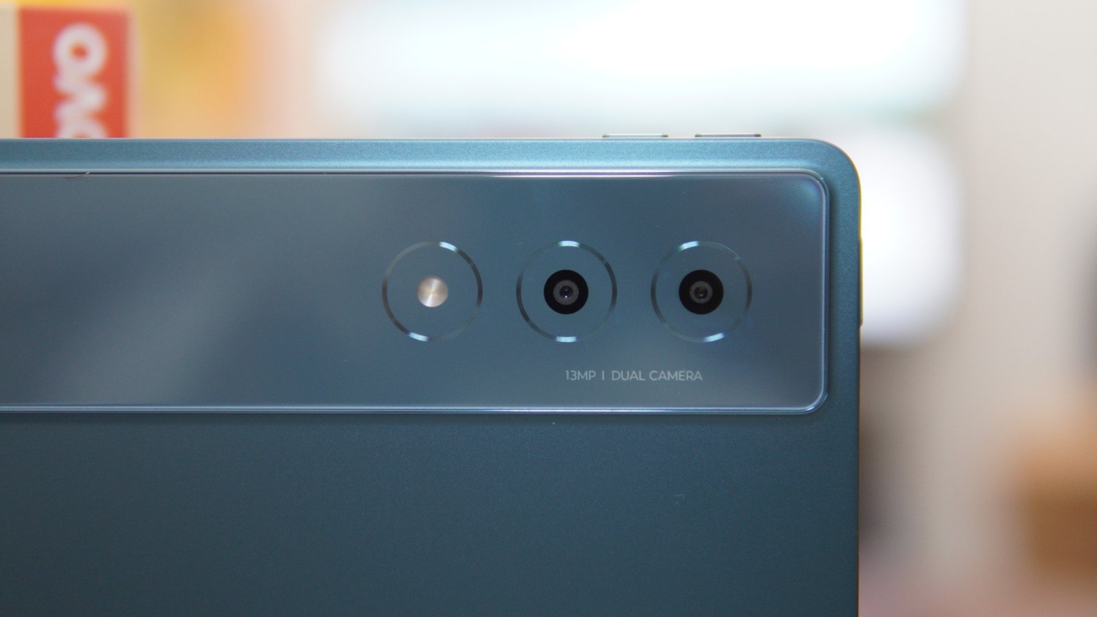 The rear side of the tablet also features the Tidal Teal color treatment, along with the Lenovo branding in the middle. There is also a reflective camera island that covers from left to right on the top portion of the rear side. The camera island features two rear-facing cameras and one flash module.