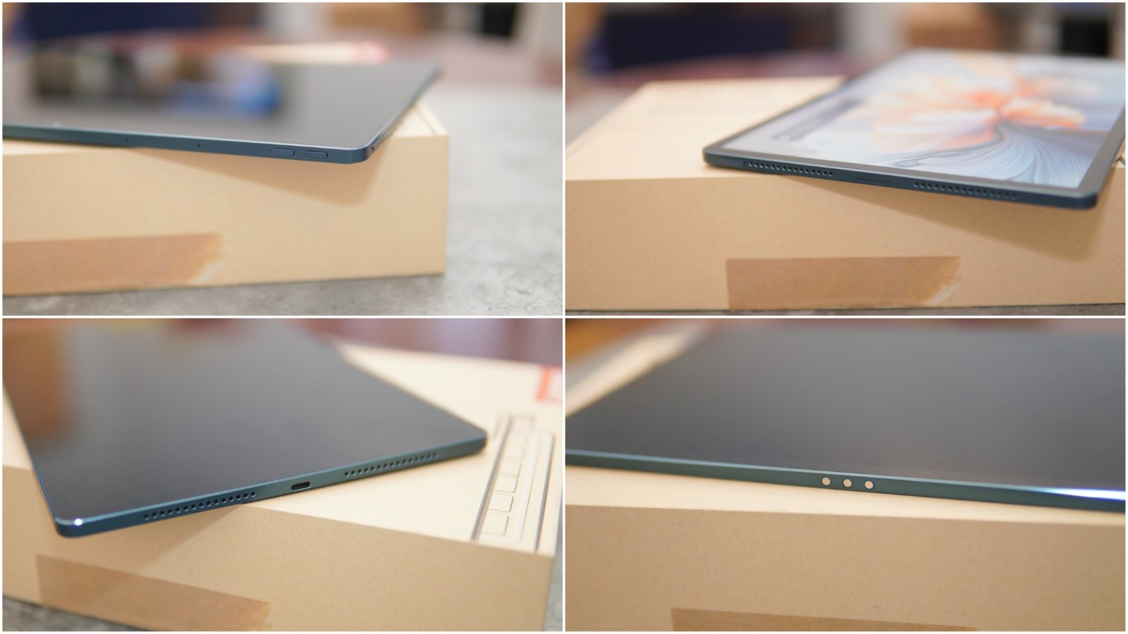 The tablet comes with four Harman Kardon SLS subwoofer speaker holes in total, two on either side of the device, along with two extra solo tweeters. The USB-C port is on the right side, and the power button is on the left side. The volume control buttons are located on the top side. The bottom side of the tablet features the magnetic connectors for accessories such as keyboards.