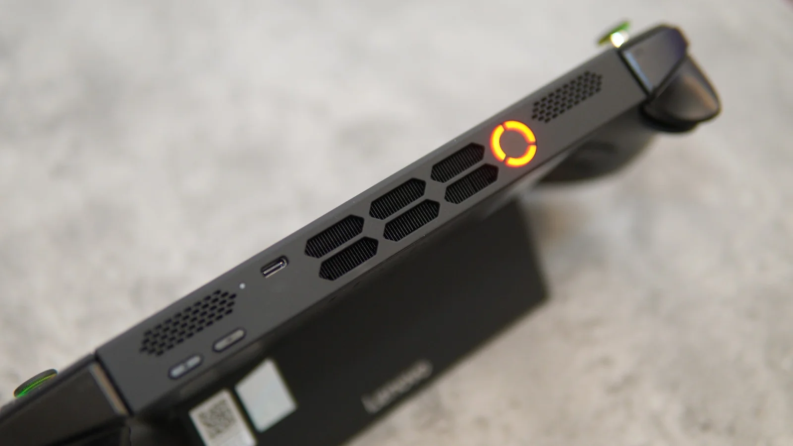 The exhaust air vents that push out the hot air are located on the top side, along with the volume rockers, the main power button, and more. The power button is surrounded with LEDs for a gamer-centric effect. The design of the three LEDs that surround the power button in a circular fashion resembles the “O” logo on the Lenovo Legion branding. The power button is also a fingerprint sensor. There are dual top-facing speaker grills on the top portion.